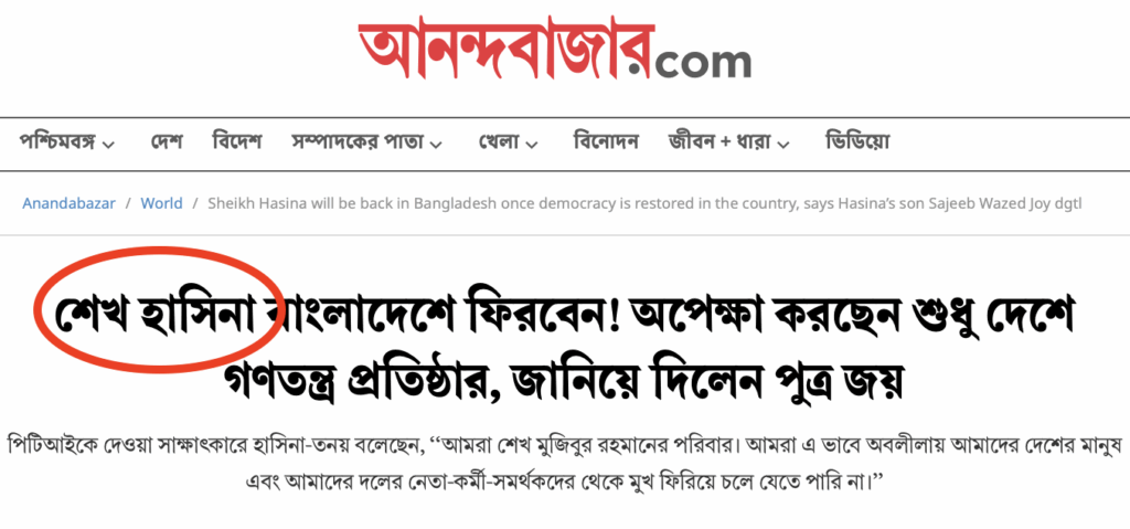 बांग्ला वेबसाइट आनंदबाजार.कॉम में शेख हसीना की स्पेलिंग – শেখ হাসিনা।