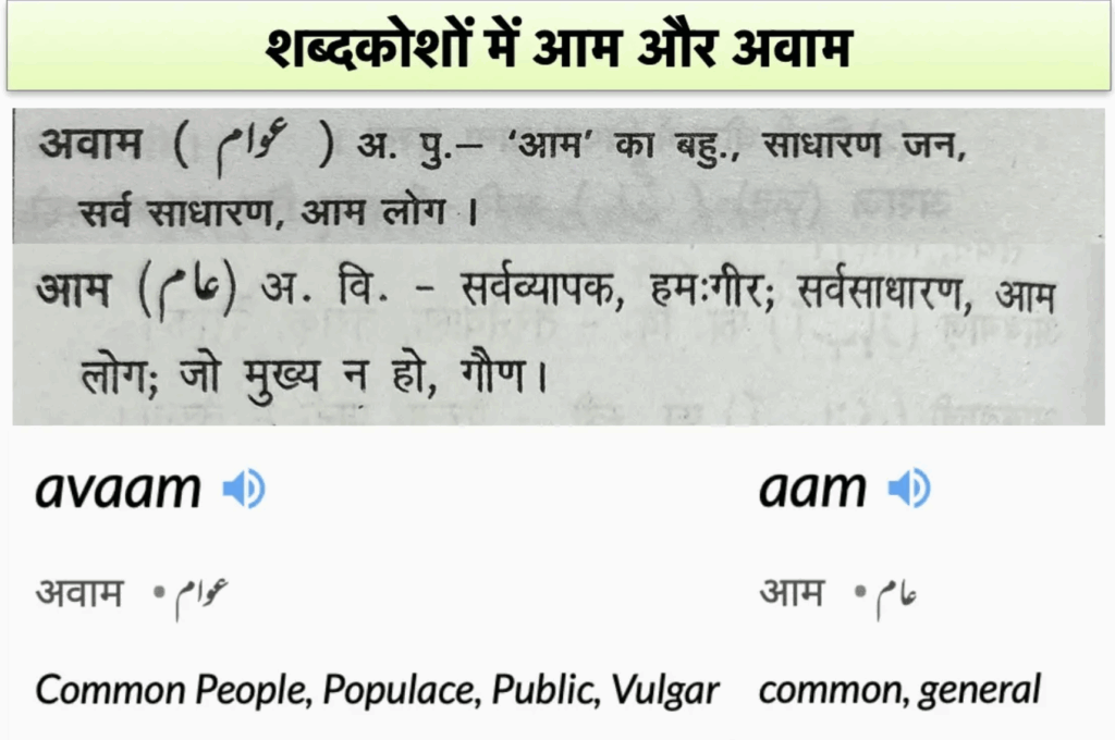 उर्दू के शब्दकोशों में आम और अवाम का मतलब।